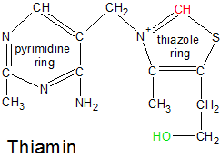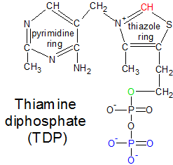 TDP with its two phosphate groups, one of which I have highlighted in blue. This is the biologically active form of thiamin. |