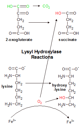 Lysyl hydroxylase begins the process by decarboxylating 2-oxoglutarate, discarding the severed fragment as CO2. It then uses an iron (Fe2+) atom to break the O2 molecule apart. One oxygen atom is bound to the remains of 2-oxoglutarate, forming a molecule of succinate, which is also discarded. The other oxygen atom (as OH) binds to lysine in a hydroylsis reaction that produces hydroxylysine. The iron atom started the reaction as (Fe2+), but lost an electron in the process and is now (Fe3+). This is where ascorbate comes in.