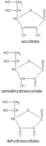 Vitamin C molecules fluctuate between three structural forms as they participate in biological processes where they donate one or two electrons. The forms are ascorbic acid (ascorbate), semidehydroascorbic acid (semidehydroascorbate) and de-hydroascorbic acid (dehydroascorbate). Ascorbic acid is the reduced form of vitamin C (has both of its electrons) and dehydroascorbic acid is the oxidized form (gave up both electrons). Semidehydroascorbic acid has donated only one of its two electrons.